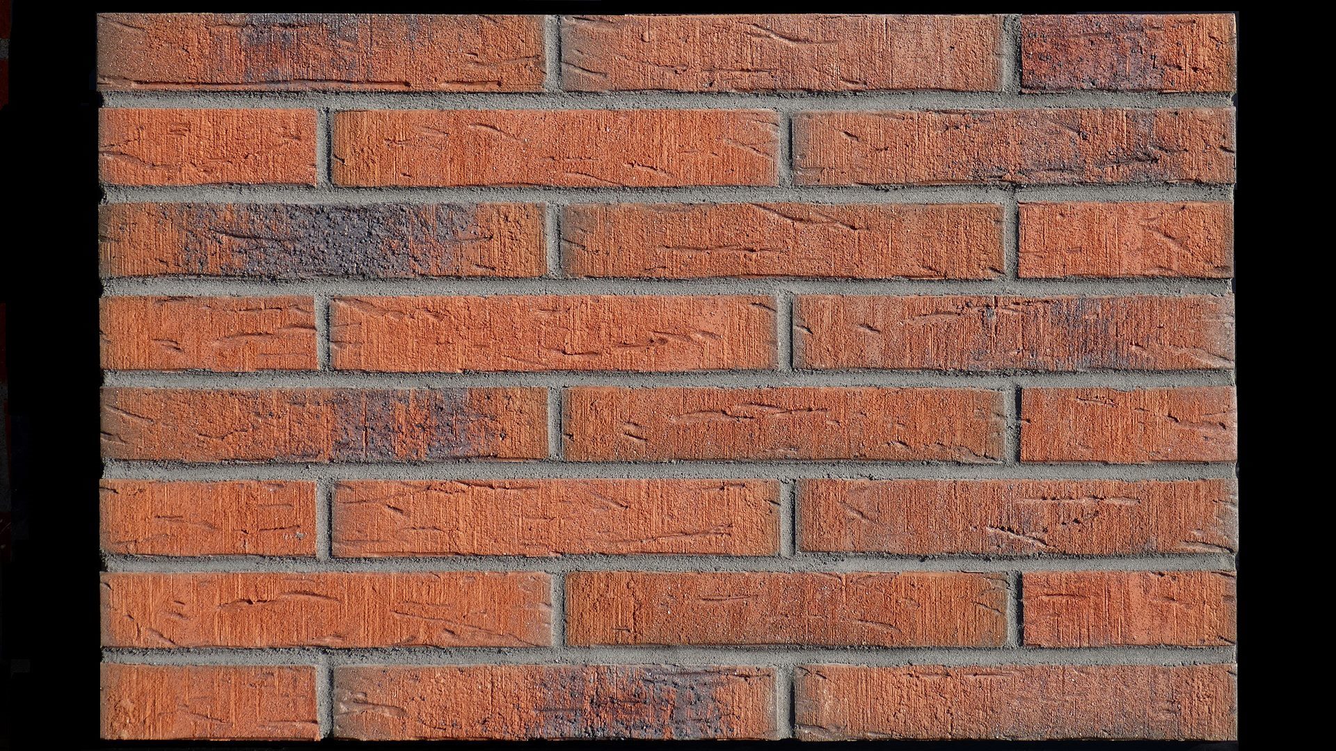 Terrakotta-narancsvörös alapon világosbarna és kékes-lilás égetési foltokkal tarkított, rusztikus felületű, hosszú, keskeny homlokzatburkoló lap.
