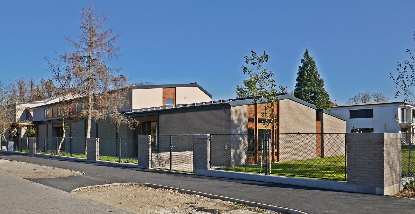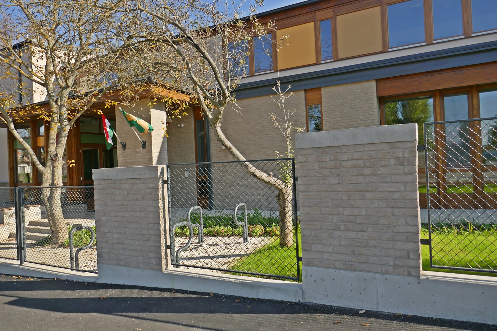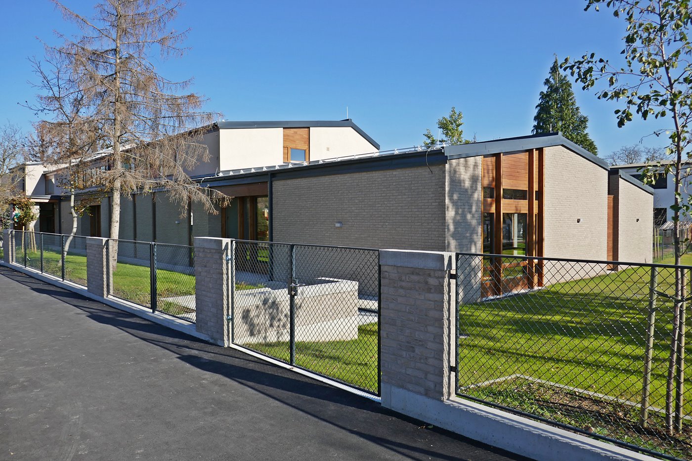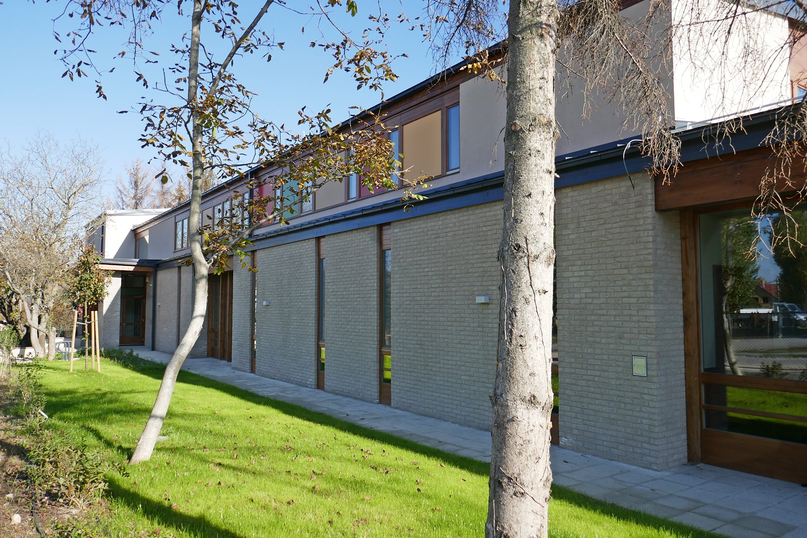 Óvoda szürke színű tégla homlokzatburkolattal