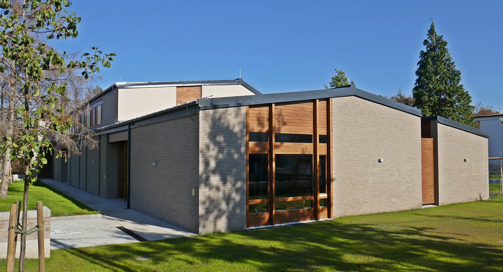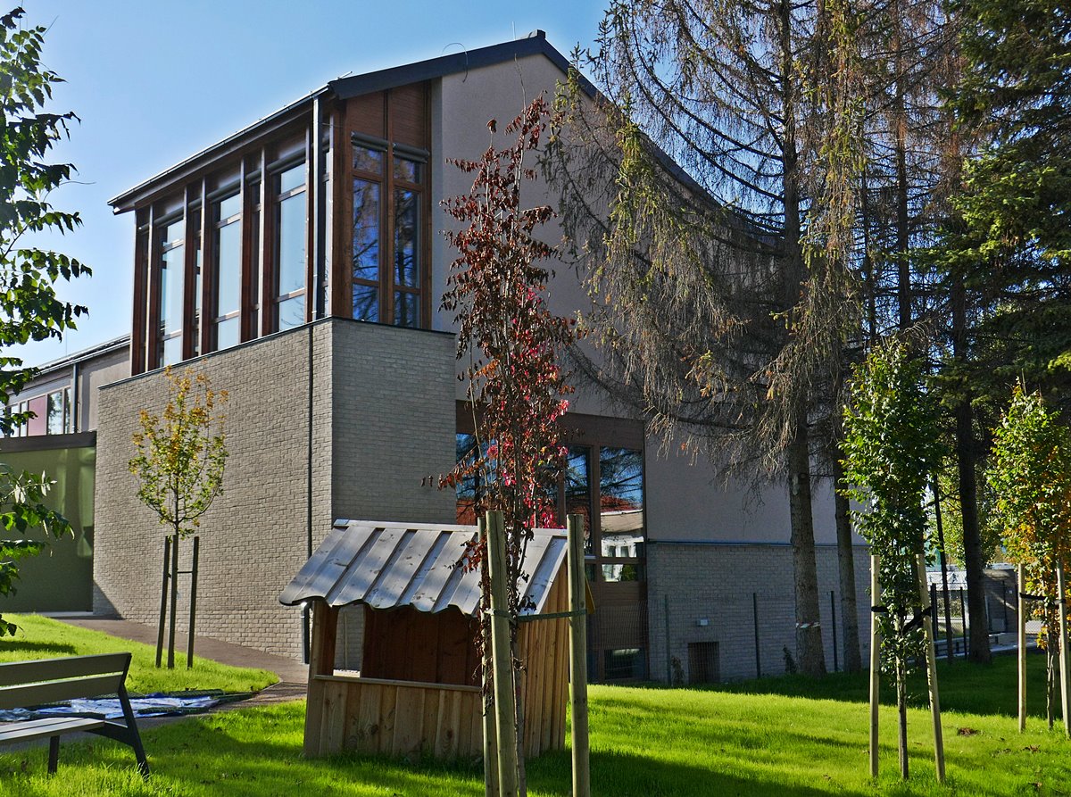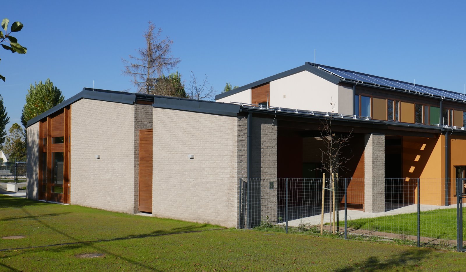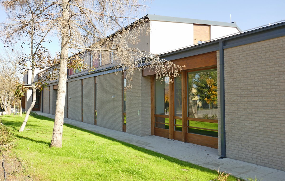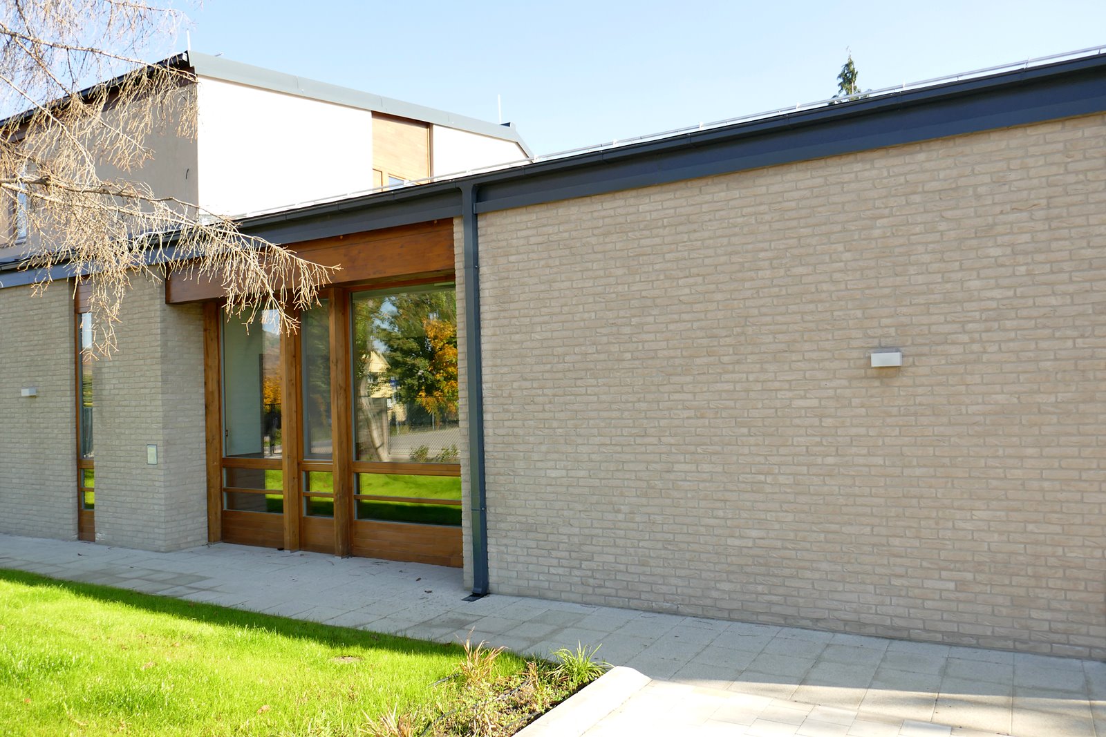 Óvoda szürke színű tégla homlokzatburkolattal